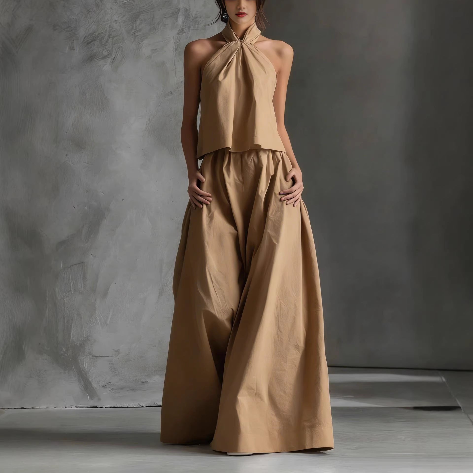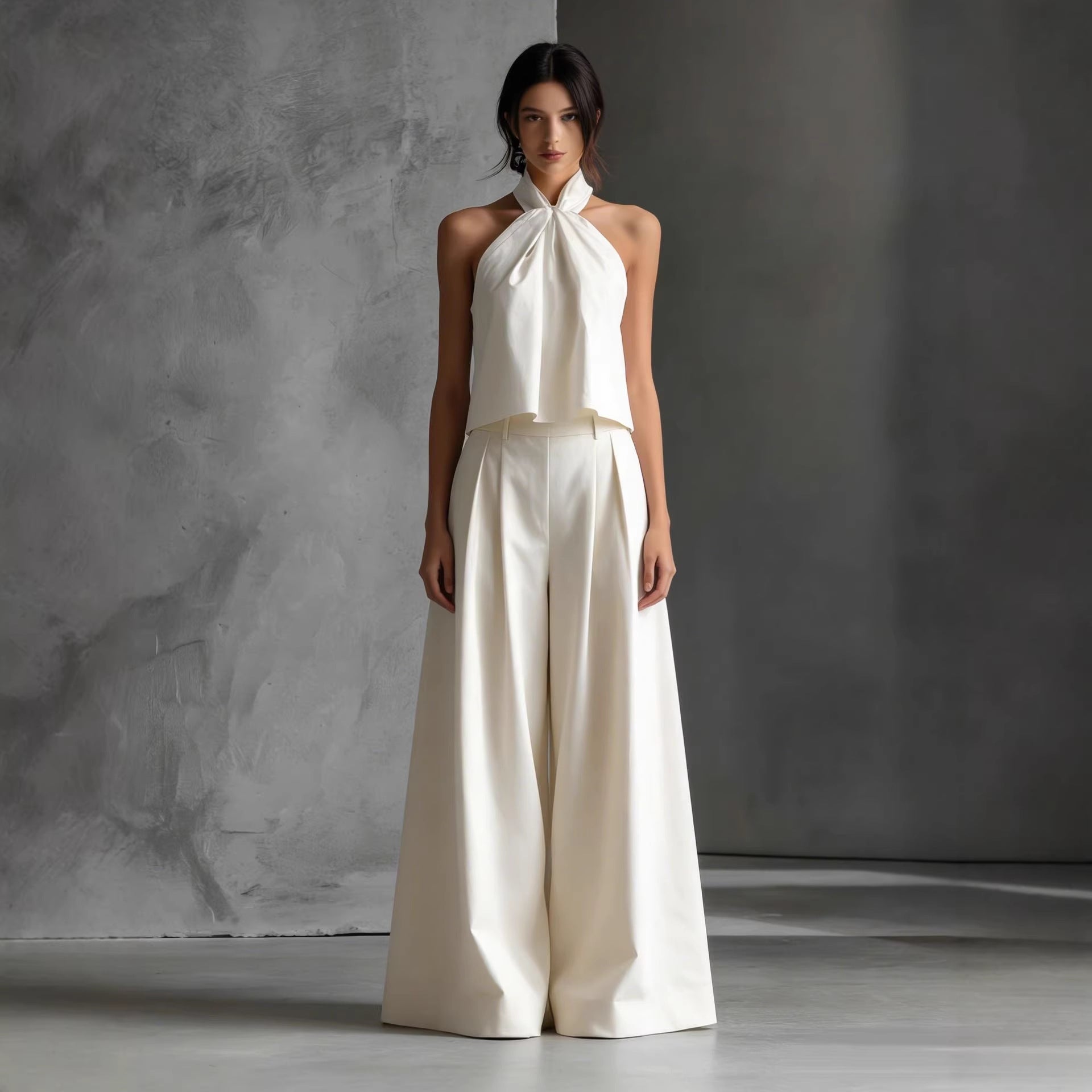 Cet ensemble deux-pièces incarne le luxe décontracté. Composé d'un haut dos-nu raffiné et d'un pantalon extra-large, il crée une silhouette élancée et aérienne. C’est la tenue parfaite pour celles qui recherchent un style épuré et une allure haut de gamme.